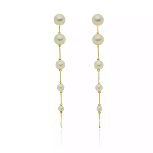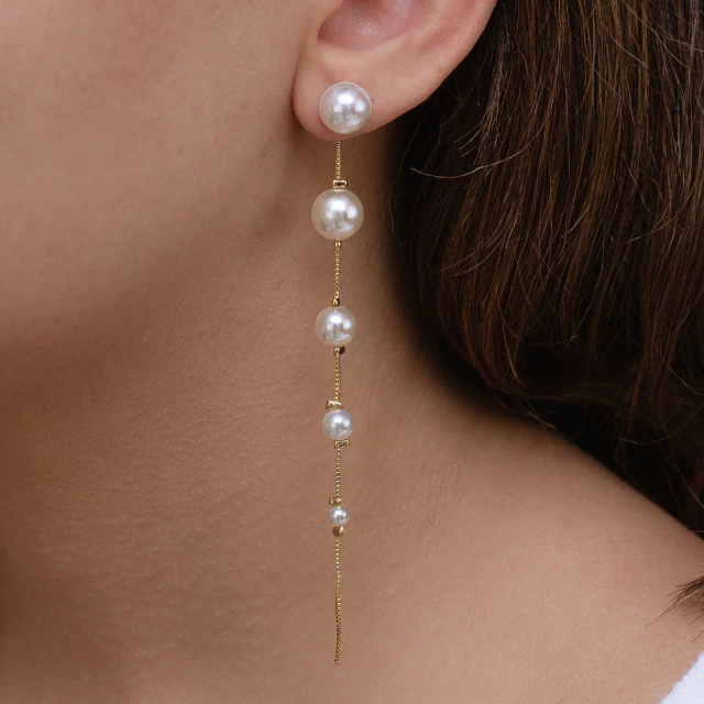 A base do brinco é uma pérola e na parte de trás encaixa no pino do brinco uma delicada corrente veneziana com outras pérolas em intervalos regulares sendo a última pérola um pouco menor.