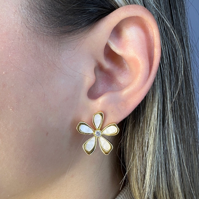 Brinco Flor Pétalas Madrepérola Banhado em Ouro 18k