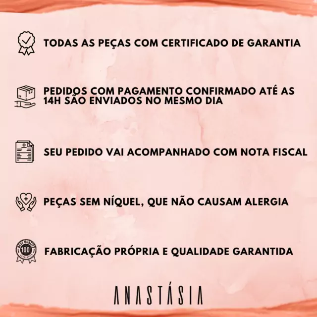 Os nossos produtos têm alto teor de banho de ouro 18k, qualidade e durabilidade acima da média por que seguimos os padrões internacionais de qualidade. Somos fabricantes e por isso temos preços mais acessíveis, qualidade superior no acabamento e peças que parecem joias. Não utilizamos níquel, cádmio ou chumbo em nossa fórmula de banho de ouro 18k para não causar alergias e não poluir o produto com metais de baixa qualidade, cumprindo normas internacionais de saúde. A Anastásia Joias está a 10 anos no mercado. Somos fabricantes e vendemos no atacado e varejo para todo o Brasil. Nossos milhares de clientes satisfeitos nas nossas r&des sociais em toda a internet comprovam que a Anastásia Joias é uma loja totalmente segura para você realizar suas compras. Faça o teste você também e adquira uma das melhores semijoias da internet! Garantimos que é mais bonito do que nas fotos, ou devolvemos seu dinheiro!