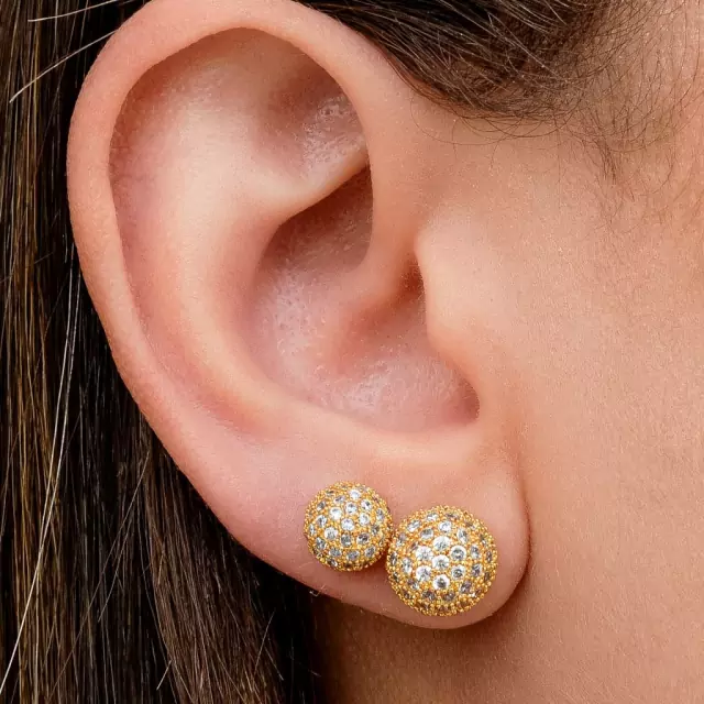 Brinco grande de esfera cravejada com micro zircônias cor cristal Banhado em ouro 18k
